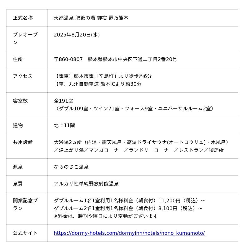 『御宿 野乃熊本』公式WEBサイト: https://dormy-hotels.com/dormyinn/hotels/nono_kumamoto/