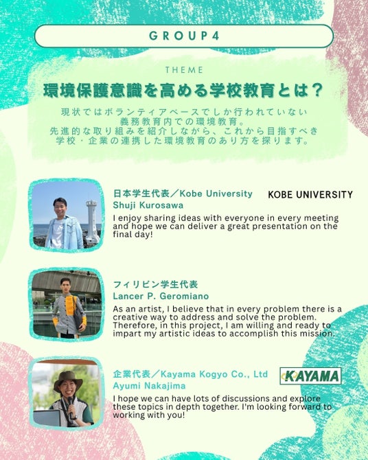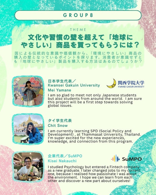 2025年5月~8月にかけて企業が提示する環境課題に対して、異なる考え方・価値観をもつ学生たちが意見交換を重ねてきました。環境問題は世界中の国々が共通して抱える喫緊の問題です。未来を担う学生たちが世界の同年代と協力して課題に挑む過程は、地理的な制約や言語・文化の違いなどがあり決して容易ではありませんが、多様な背景をもつ学生たちが協働することで新たな解決策を生み出し世界が共通して抱える課題に対して国を超えて協力する力を育てることを目指します。