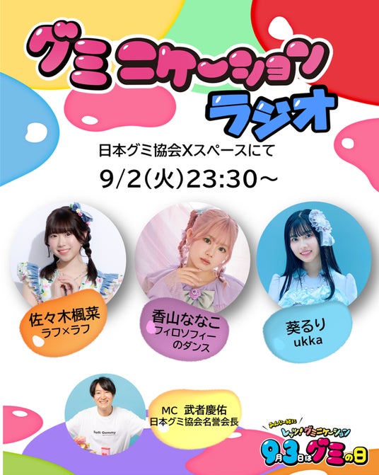 グミの日前日の9月2日(火)23:30から、日本グミ協会公式Xのスペースにて配信。日本グミ協会名誉会員でもある「ラフ×ラフ」佐々木楓菜さん、「フィロソフィーのダンス」香山ななこさん、「ukka」葵るりさんをゲストにお招きしてお送りします。番組では、3人ならではのグミの楽しみ方や、グミに関するトークをお届け予定です。お気に入りのグミを片手に、是非ご参加ください。