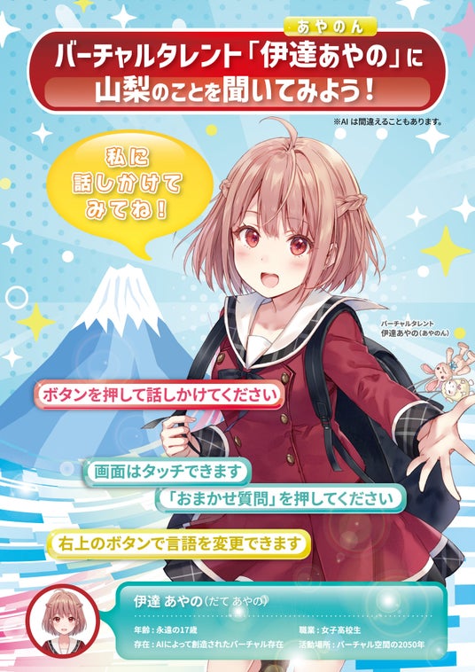 - 体験内容:バーチャルタレント「伊達あやの」とのAI多言語リアルタイム対話(日本語・英語 ほか)