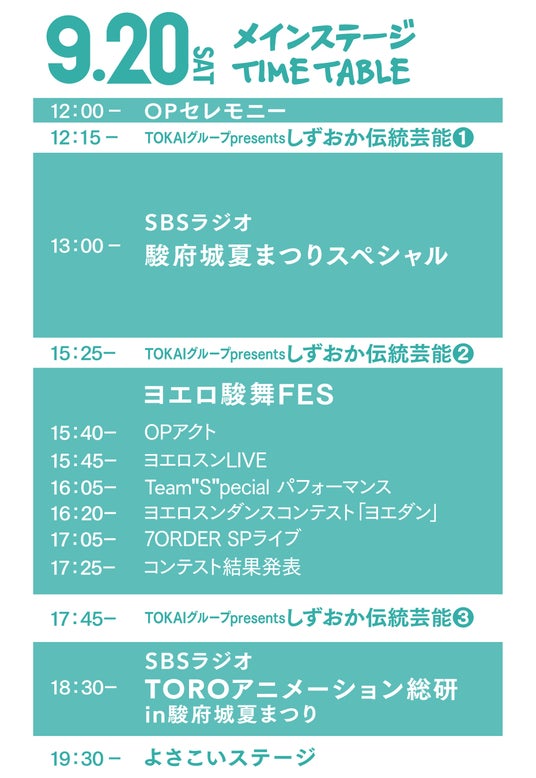 そのほか、よさこいのステージやライブ、飲食ブースなどが盛りだくさんです。ぜひ、9月20日(土)、21日(日)は駿府城公園にご来場ください。9月21日のメインステージプログラムや詳細は、イベント公式ホームページやSNSアカウント等で随時発表いたします。