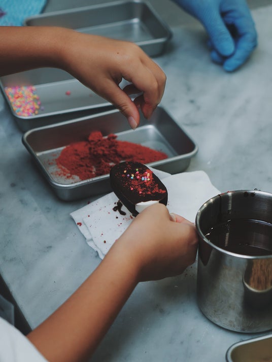スティックアイスにチョコレートやピスタチオなどをそれぞれの創意でトッピング。会場に「うまくいったよー!」の声が響きました。
