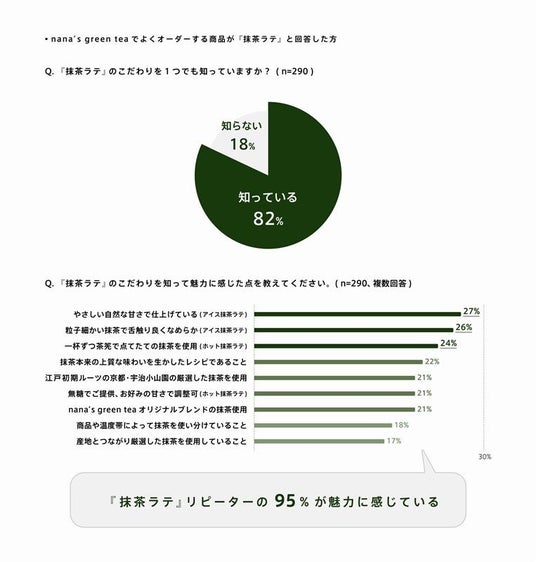 2025年6月に実施した顧客アンケート(n=1470)によると、抹茶ラテを日頃からよく注文するリピーターのお客様(n=290)でも、商品のこだわりを1つも知らなかった方が18%いることが分かりました。しかし、そのこだわりを知った後には95%が魅力的と感じたと回答。特に「アイス抹茶ラテの自然な甘さ」や「なめらかな舌触り」が高く評価されました。