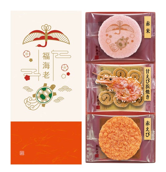 『福海老』は、長寿の象徴である「鶴と亀」を描いたえびせんべいと、「腰が曲がるまでお元気で」という想いを込めた甘えびの浜焼き、えびの濃厚な旨みが楽しめる「赤えび炙り焼き」の3種類を詰め合わせた、敬老の日の贈り物にぴったりなお品です。