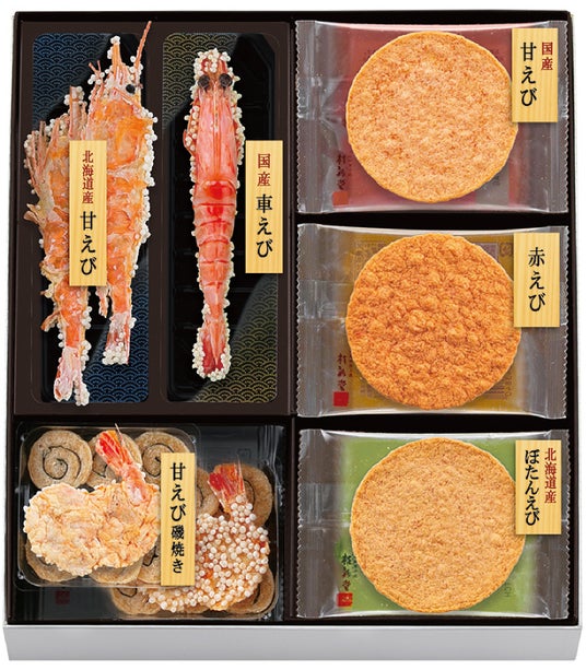 海老づくし桂新堂を代表する海老菓子である「あられ焼き」「姿焼き」「磯焼き」「炙り焼き」を詰め合わせました。