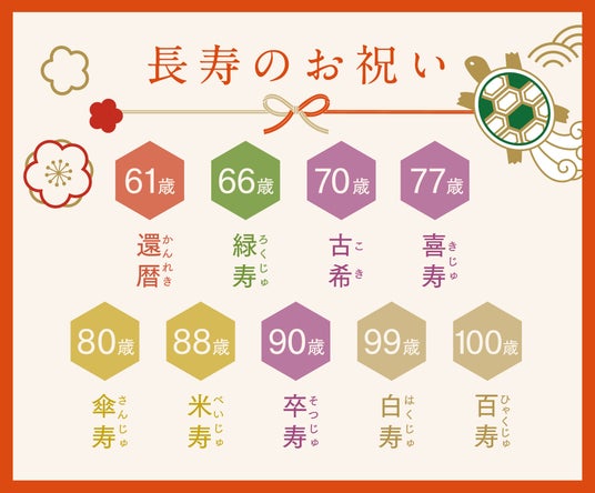 長寿のお祝いは、年齢ごとにその呼び名が変わります。大切な方の人生の節目をお祝いしてみませんか。