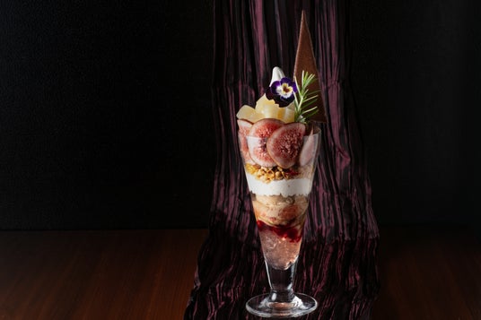パフェの中間層には香ばしいグラノーラや生クリーム、メープルアイス、イチジクのコンポート、下層には芳醇な赤ワインソースとイチジクのジュレを配し、贅沢な果実感とともに食べ進めるごとに味わいの変化が現れます。