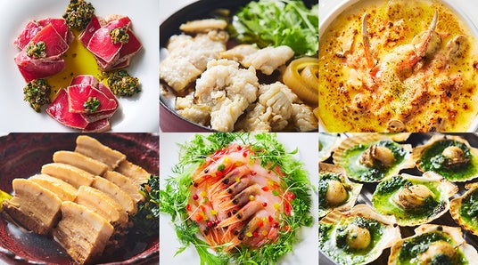 九州産マアジのエスカベッシュ、鹿児島県産桜島鶏のスパイシーサラダ(鹿児島)、熊本県産味彩豚 炙りポークサラダ(熊本)、長崎県産サバの白ワインマリネ(長崎)、辛子蓮根(熊本)、ゴーヤ薩摩揚げ(鹿児島)、九州産本マグロの炙りカルパチョ タプナードソース(ディナー限定)、秋茸のクリームパスタサラダ(ランチ限定)など