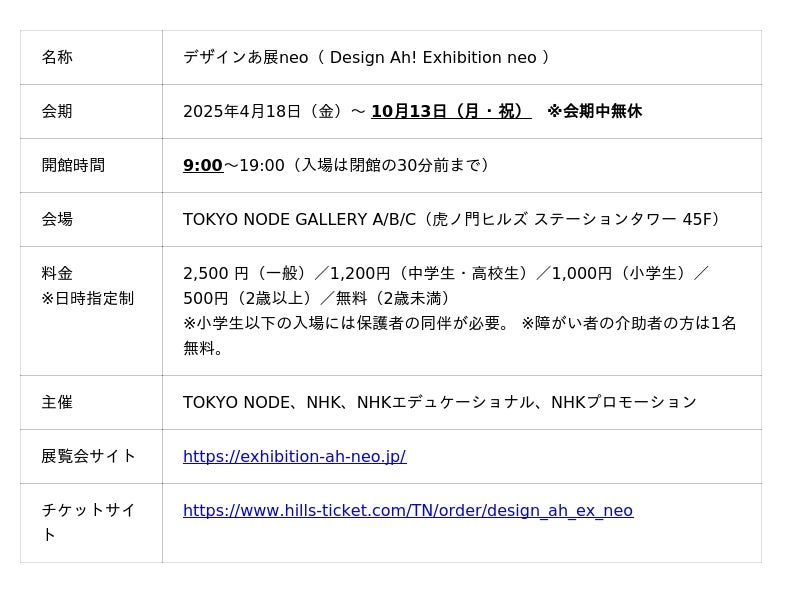 虎ノ門ヒルズの情報発信拠点「TOKYO NODE(東京ノード)」にて開催中のデザインを体感する展覧会「デザインあ展neo」(主催:TOKYO NODE(森ビル)、NHK、NHKエデュケーショナル、NHKプロモーション)は、2025年9月23日(火・祝)までとしていた会期を、ご好評につき10月13日(月・祝)まで延長します。なお、本展は国内での巡回を予定していません。