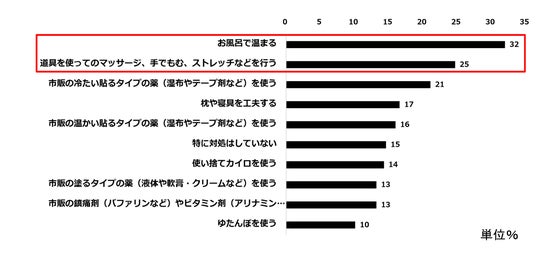 当社調査によると、20~60代男女のうち、約4割以上の方が就寝時に腰痛や肩コリの症状を抱えており、起床時にも約半数の方が症状を抱えていることがわかりました*¹²。一方で、対策方法としては「お風呂で温まる」や、「道具を使ってのマッサージ、手でもむ、ストレッチなどを行う」方が上位を占めていることもわかりました*³。