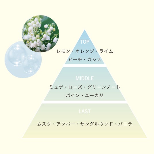 繊細で透明感のあるミュゲ(スズラン)とピュアなサボンがやさしく重なる、上品で洗練された香り。
