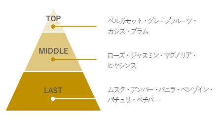フレッシュなカシスにローズやマグノリアなど華やかなフローラルを合わせた品のある香り。清潔感のあるムスクに柔らかなバニラ、深みのあるパチュリを合わせ、高級感のある香りに仕上げました。