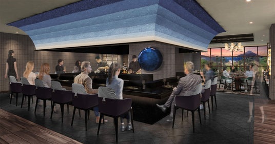 洞窟をイメージした静謐な空気に包まれたエントランスを抜けると、開かれた空間には、瑞々しい生命力が宿るような紺碧のアートと象徴的な富士の造形が。パチパチと音を立てる炭火や炎が躍動するライブカウンターは、富士の懐に燻る深紅のエネルギーを彷彿させます。炎が持つ力強さと、素材本来の旨味が引き出される香ばしい匂いは、食の真髄を極め、ゲストの五感に訴えかけます。