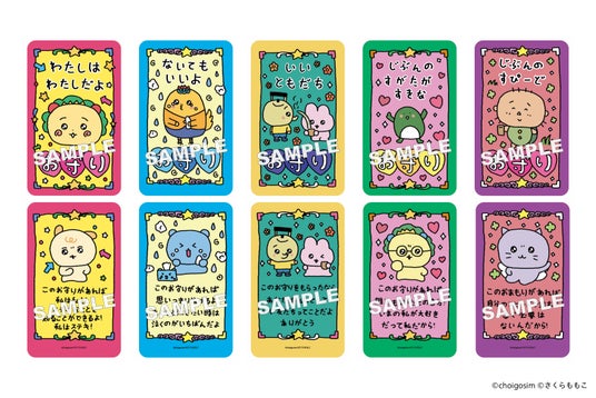 「チェゴシム」の定番人気商品・お守りカードがコラボ特別バージョンで登場。表面には「コジコジ」、裏面には「あかちゃんゴシム」が描かれた「わたしはわたしだよお守り」や、お茶を沸かした「やかん君」とそのお茶を飲む「うさゴシム」が並んだ「いいともだちお守り」など、全5種類を販売します。