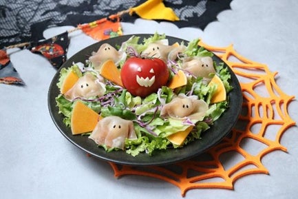 中身のモッツァレラチーズがほんのり透けて見える生ハムおばけが真っ赤なトマトのジャックオランタンを取り囲む、可愛いハロウィンサラダです。