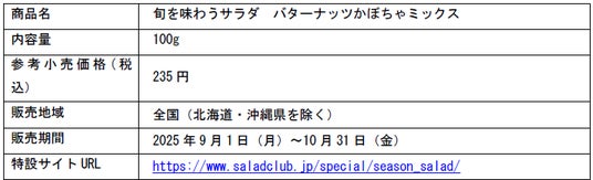 株式会社サラダクラブ(代表取締役社長:新谷昭人、本社:東京都調布市)は、2025年9月1日(月)~2025年10月31日(金)までの期間限定で、「旬を味わうサラダ バターナッツかぼちゃミックス」(100g/税込235円)を全国(北海道・沖縄県を除く)で発売します。