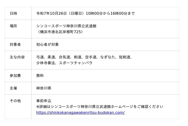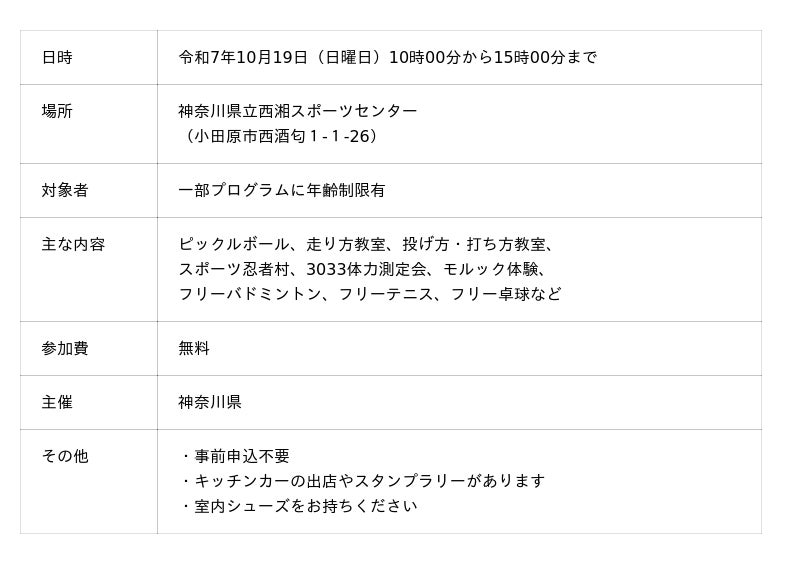 県では、神奈川県スポーツ推進条例により、10月を「県民スポーツ月間」と定めています。この月間をスポーツに親しむきっかけとしていただけるよう、市町村やスポーツ団体と連携して、県内各地で気軽にスポーツ体験ができるイベントをたくさん開催します。日頃運動不足を感じている方、気軽に運動やスポーツを始めてみましょう!(別紙1)
