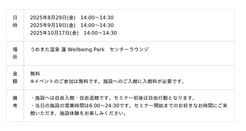 「うめきた温泉 蓮 Wellbeing Park」(総支配人:藤立 達哉、所在地:大阪市)は、2025年8月29日、9月19日、10月17日の3日間にわたり、「マルコメ株式会社」(代表取締役社長:青木 時男、所在地:長野県長野市)と共同で「発酵のチカラ」をテーマにした健康セミナーを開催することをお知らせします。