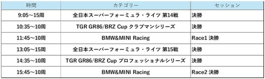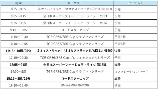 また、国内最多の参戦台数を誇るナンバー付きワンメイクレース「TOYOTA GAZOO Racing GR86/BRZ Cup」や「BMW & MINI Racing」など、16日(土)に4レース、17日(日)に6レースの2日間で合計10レースを観戦いただけます。