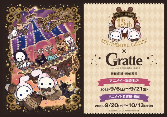 株式会社アニメイトは、「『センチメンタルサーカス』15周年×Gratte」をアニメイト池袋本店にて2025年9月6日~9月21日まで、アニメイト名古屋、梅田にて9月20日~10月13日まで、それぞれ開催いたします。