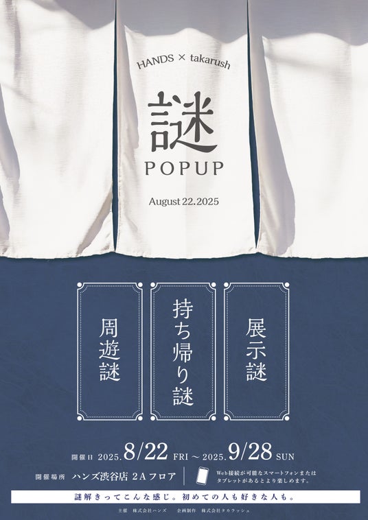 株式会社ハンズ(本社:東京都新宿区)は、2025年8月22日(金)より、ハンズ渋谷店にて謎解きをお楽しみいただける「謎POPUP」を開催いたします。本イベントでは、初めて謎解きに触れる方から謎解きファンまで、幅広くお楽しみいただける3つの体験をご用意しました。フロアごとに異なるテーマで構成され、らせん状の階段が印象的なハンズ渋谷店を巡る「周遊型謎解き」、身近な商品と連動した「展示型謎解き」、そして自宅でも楽しめる「持ち帰り謎解きキット」。それぞれ異なるスタイルで、「謎解き」の奥深い世界をご体感ください。