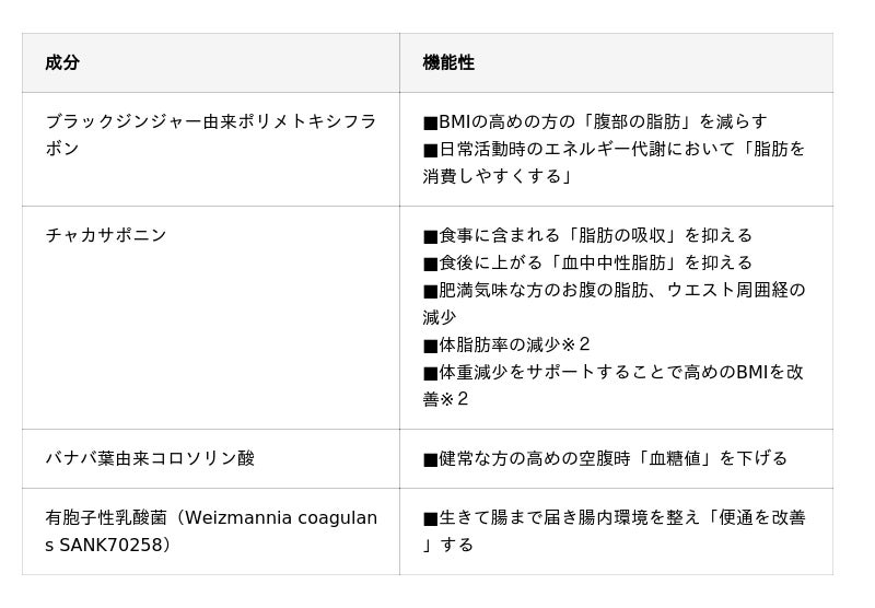 ※1:チャカサポニン・ブラックジンジャー由来ポリメトキシフラボン・バナバ葉由来コロソリン酸・有胞子性乳酸菌(Weizmannia coagulans SANK70258)を関与成分とした機能性表示食品の処方は日本初処方。(2025年7月31日時点当社調べ)