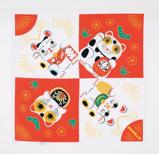 縁起柄の風呂敷や巾着、折ると干支の動物になる折り紙、フーズなど幅広い商品を展開。