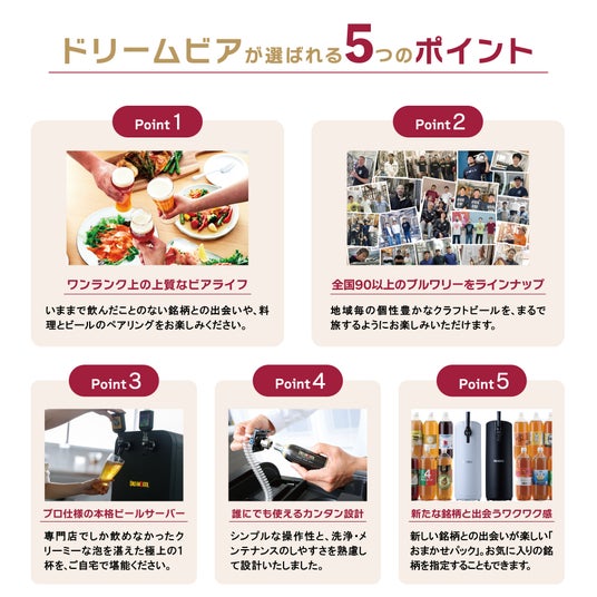 ドリームビアは、プロ仕様の家庭用本格ビールサーバーで、全国各地のクラフトビールを、まるで旅するように楽しめる会員制サービスです。作り手の想いと、ビールの持つ奥深い味わいや楽しみ方をお客様にお届けすることで、日本のビール文化をもっと豊かに、延いては日本の地域創生の一助となることを目指します。