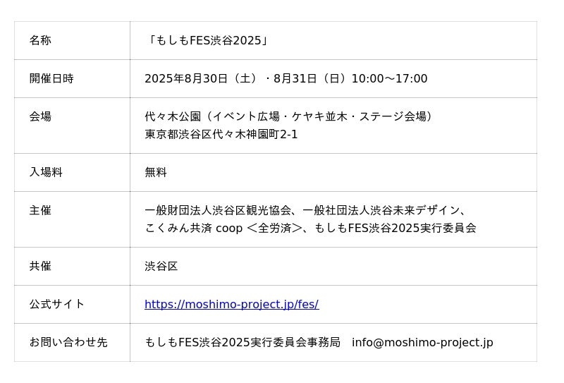 一般財団法人渋谷区観光協会(代表理事:金山淳吾 所在地:東京都渋谷区)と、一般社団法人渋谷未来デザイン(代表理事:小泉秀樹)、こくみん共済 coop 〈全労済〉(全国労働者共済生活協同組合連合会 代表理事 理事長:打越秋一)の3団体は、渋谷区の共催のもと、『もしもFES渋谷2025』を、2025年8月30日(土)・31日(日)の2日間、代々木公園にて開催いたします。