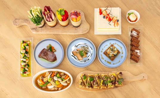 本ランチはセミブッフェ形式で、シェフがこだわり抜いた3種類のメイン料理からお好みの1品をお選びいただけます。お客様の目の前で、上質な九州産黒毛和牛をヒマラヤ岩塩の上で炙って提供する「九州産A4黒毛和牛の岩塩炙り」、高級食材の鮑を秋の味覚である南瓜と合わせ、バター醤油でパイピザに仕立てた「鮑と南瓜のバター醤油風パイピザ」、そして銀鮭と秋茄子をミルフィーユ状に重ね、2種のソースでさっぱりと仕上げた「銀鮭と茄子のミルフィーユ ヴァンブランソースとバルサミコ」を用意しました。