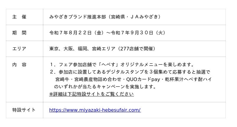 みやざきブランド推進本部(宮崎県・JAみやざき)は、東京・大阪・福岡・宮崎エリアの飲食店(277店舗)と連携し、宮崎県の特産柑橘「へべす」を使ったオリジナルメニューが味わえる「みやざきへべすフェア2025」を開催します。