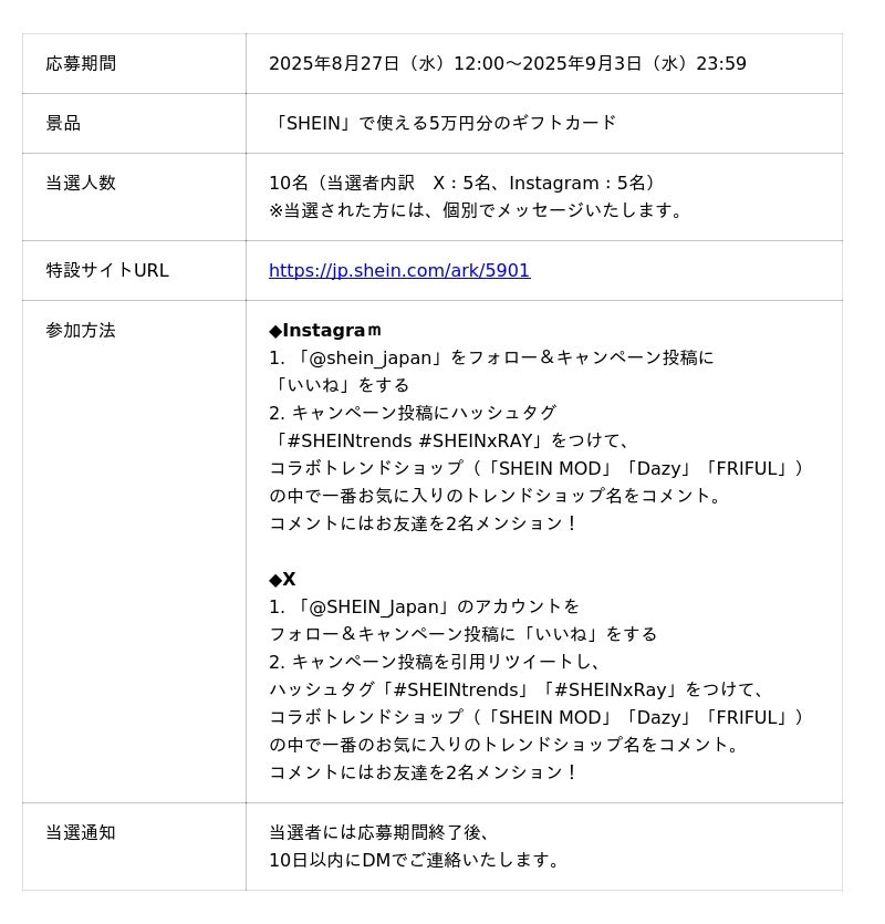 「SHEIN」×『Ray』のタイアップを記念し、「SHEIN」で使える5万円分のギフトカードを合計10名にプレゼントするSNSキャンペーンを実施しています。■キャンペーン概要