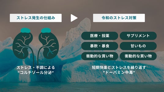 ストレスや不調を感じると副腎からコルチゾール(ストレスホルモン)が分泌されます。これが意欲の低下、免疫力の低下、体脂肪の蓄積、睡眠の質の低下を招きます。現代人はこのストレスや不調に打ち勝とうと、医療や投薬、サプリメントやパジャマの購入、ジュースやスイーツによる血糖値上昇、暴飲暴食やSNSの無限スクロール等、これまで多くの対処療法を実践してきました。