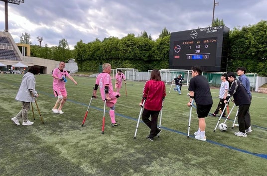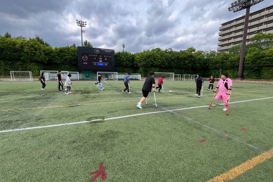 体験会では、まずクラッチを持ち片足で歩くことから始め、パスやドリブル、最後にはミニゲーム形式での試合を楽しみました。サッカー経験者でも同じようにプレーすることは難しかった模様で、「片足でトラップしてボールを蹴るという動作が普段とは違った動きでした。歩くのもやっとで、結構な体力を使いました」、「いつもなら届くような距離も、あと一歩届かない、かすめるだけといったところがあり、選手のすごさを体感しました」、「試合を観戦しているときは、もしかしたら上手にプレーできるかもと思っていましたが、クラッチを持ちながら片足でプレーすることは怖く、難しいものでした。軸足がクラッチになるので、支えながらプレーすることが一番難しかったです」など、感想が集まりました。