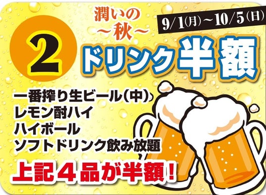 9月1日(月)~10月5日(日)までの期間、生ビール・レモンサワー・ハイボール・ソフトドリンクの飲み放題を半額でご提供いたします。秋の味覚と相性抜群のお飲み物を、お得にご堪能ください。