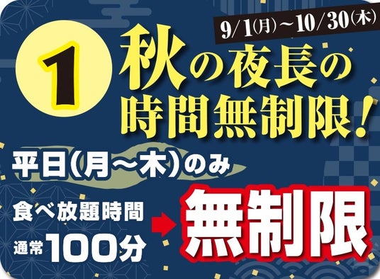 通常100分の食べ放題が、9月・10月の平日は時間無制限でお楽しみいただけます。ご家族やご友人との会食を、時間を気にせずゆったりお過ごしください。