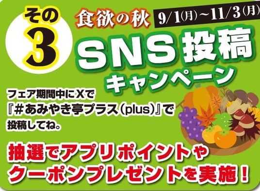 X(旧Twitter)にて「#あみやき亭plus」を付けて写真や感想を投稿していただいたお客様に、アプリポイントやクーポンをプレゼント。お客様同士で楽しさを共有しながら、より多くの方に和フェアを知っていただけます。