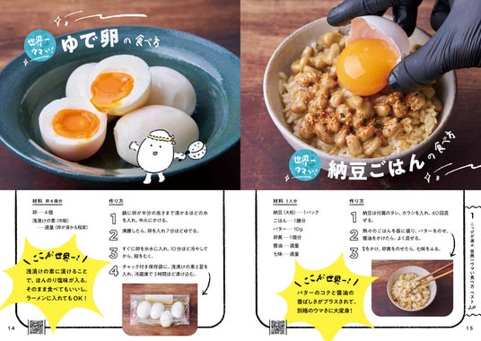 ゆで卵、納豆ごはんからアジフライ、ステーキまで、「家で作れる、世界一ウマいレシピを楽しんでもらいたい!」というコンセプトの一冊です。
