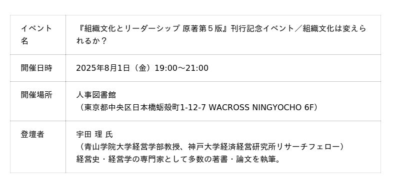 人事に関わる全ての人が集い、学び合うコミュニティ「人事図書館」では、組織文化とリーダーシップの関係性に関心を持つ多くの方の課題意識に応えるべく、『組織文化とリーダーシップ 原著第5版』の監修・監訳者である宇田 理氏を講師にお招きし、刊行記念イベントを企画しました。