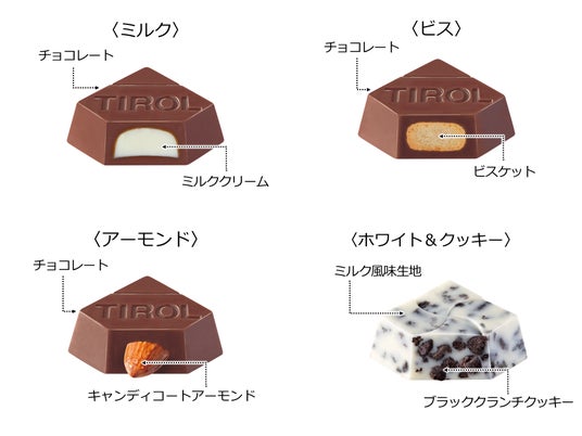 1990年の発売から生産量No.1で人気のなめらか食感の「ミルク」サクサクの「ビス」やカリカリの「アーモンド」、ザクザク食感がクセになる「ホワイト&クッキー」など人気の4種が入ったお得なパックです。食感が違うので食べ飽きることなく楽しむことができます。