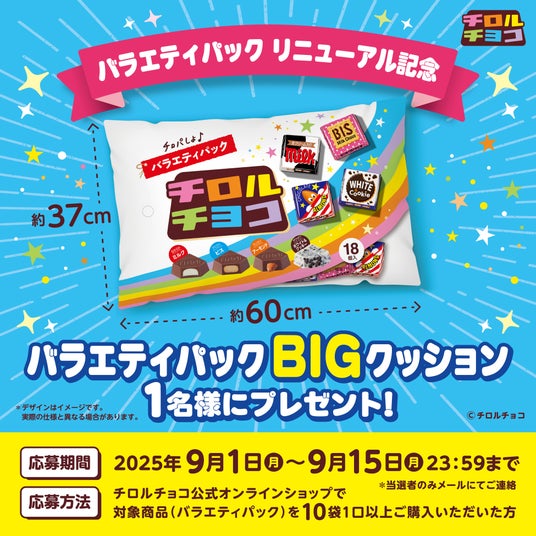 チロルチョコ公式オンラインショップ限定でバラエティパックBIGクッションが1名様に当たるキャンペーンを実施いたします。
