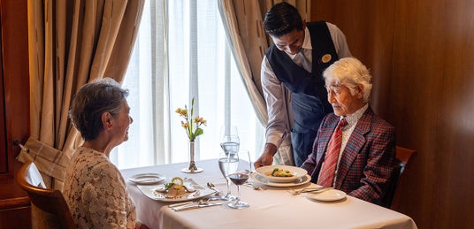 船内に2つあるレストランでは、その日の気分に合わせてチョイスできる料理やアップグレードメニュー、和食、寄港先にちなんだ多彩な料理をゆったりと楽しめるほか、持続可能な漁業で漁獲され適切に管理されたMSC認証の水産物や、認証済み養殖場から供給されたASC認証の水産物を積極的に取り入れることで、持続可能な水産業への貢献にも努めています。