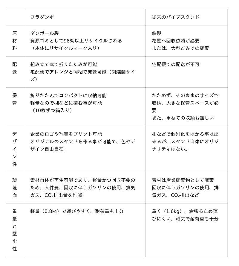 喜んで貰いたい気持ちで贈ったはずの花が、贈られた側の負担になってしまっている。その負担がなくなれば、贈られる側はもっと嬉しく、贈る側ももっと贈りやすくなるのでないか?そんな思いを起点に生まれたのが、軽くて丈夫で後処理の心配がないダンボールでできたフラワースタンド「フラダンボ」です。(「フラワー」+「ダンボール」=フラダンボで覚えてください!)