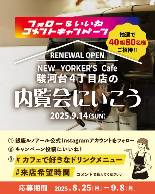 銀座ルノアール公式Instagramアカウントにて『NEW YORKER'S Cafe 駿河台4丁目店の内覧会に行こうフォロー&いいね(ハート)コメントキャンペーン!』実施いたします。