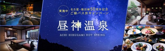 移動と分野の垣根を超えたCROSS(融合)から生まれる新たな価値を創造するWILLER ACROSS株式会社(本社:東京都中央区、代表取締役社長:宿谷勝士、以下「WILLER ACROSS」)は、名鉄バス株式会社(本社:愛知県名古屋市、代表取締役社長:瀧修一)と信南交通株式会社(本社:長野県飯田市、代表取締役社長:中島一夫)が運行する「名古屋~飯田線」の運行50周年を記念し、株式会社阿智昼神観光局(本社:長野県下伊那郡阿智村、代表取締役社長:白澤裕次、以下「阿智昼神観光局」)との連携による、昼神温泉の宿泊と高速バスがセットになった「昼神温泉 高速バスセットプラン」の「ご縁(50)バス旅キャンペーン」(以下「本キャンペーン」)を、予約サイト「WILLER TRAVEL」(以下「WILLERサイト」、URL:https://travel.willer.co.jp/tour/campaign/hotsprings/hirugami/)にて、2025年8月25日(月)より開始します。