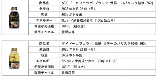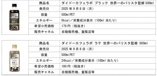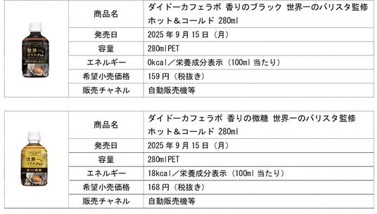 ダイドードリンコ株式会社(本社:大阪市北区、代表取締役社長:中島 孝徳)は、2025年の秋冬新商品として、「ダイドーカフェラボ ブラック 世界一のバリスタ監修 500ml」、「ダイドーカフェラボ ラテ 世界一のバリスタ監修 500ml」を9月8日(月)、「ダイドーカフェラボ 香りのブラック 世界一のバリスタ監修ホット&コールド 280ml」、「ダイドーカフェラボ 香りの微糖 世界一のバリスタ監修ホット&コールド 280ml」を9月15日(月)、「ダイドーカフェラボ ブラック 世界一のバリスタ監修 260g」、「ダイドーカフェラボ 微糖 世界一のバリスタ監修 260g」を9月22日(月)より発売いたします。
