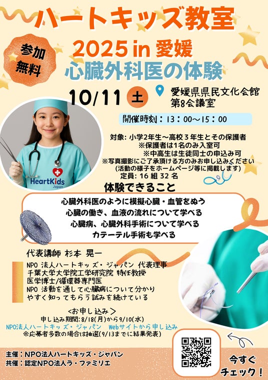 NPO法人ハートキッズ・ジャパンは、認定NPO法人ラ・ファミリエと共催で、子ども向け医療体験ワークショップ「ハートキッズ教室 2025 in 愛媛」を2025年10月11日(土)、愛媛県県民文化会館 第8会議室にて開催いたします。