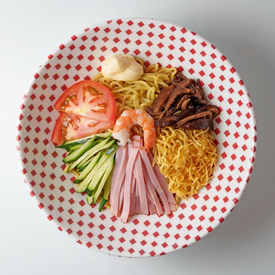 【きのかわ軒】醤油ベースのさっぱりタレに、ハム、しいたけ、錦糸卵、トマト、きゅうり、えびを彩り豊かに盛り付けた冷やし中華です。ほどよい酸味が食欲をそそり、ひと口ごとに爽やかな味わいを楽しめます。王道の味わいながらも、具材の彩りや食感のバランスにこだわり、見た目にも美しい一品に仕上げました。まだまだ暑い日が続くこの季節に、さっぱりとした美味しさをぜひお楽しみください。