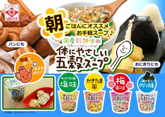 当商品「カップ五穀スープシリーズ」は、2011年9月に発売し、現在は【あっさり和風塩味】【かきたま風】【梅風味】の3フレーバーを取り揃えております。
