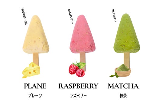 特徴:三角フォルムの「サスチ」は、製造過程で発生する端材を使用した、「食べて社会貢献できる」サステナブルスイーツです。冷凍の状態でご提供し、口に入れた瞬間になめらかなチーズの味わいと、それぞれ3種類のフレーバー(プレーン、ラズベリー、抹茶)が広がります。